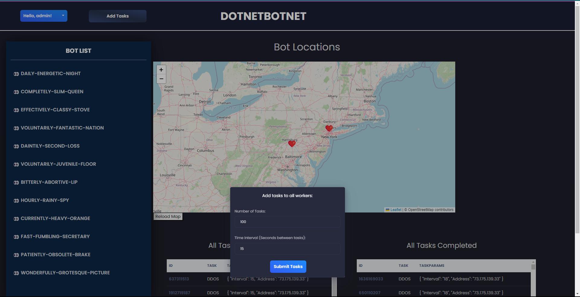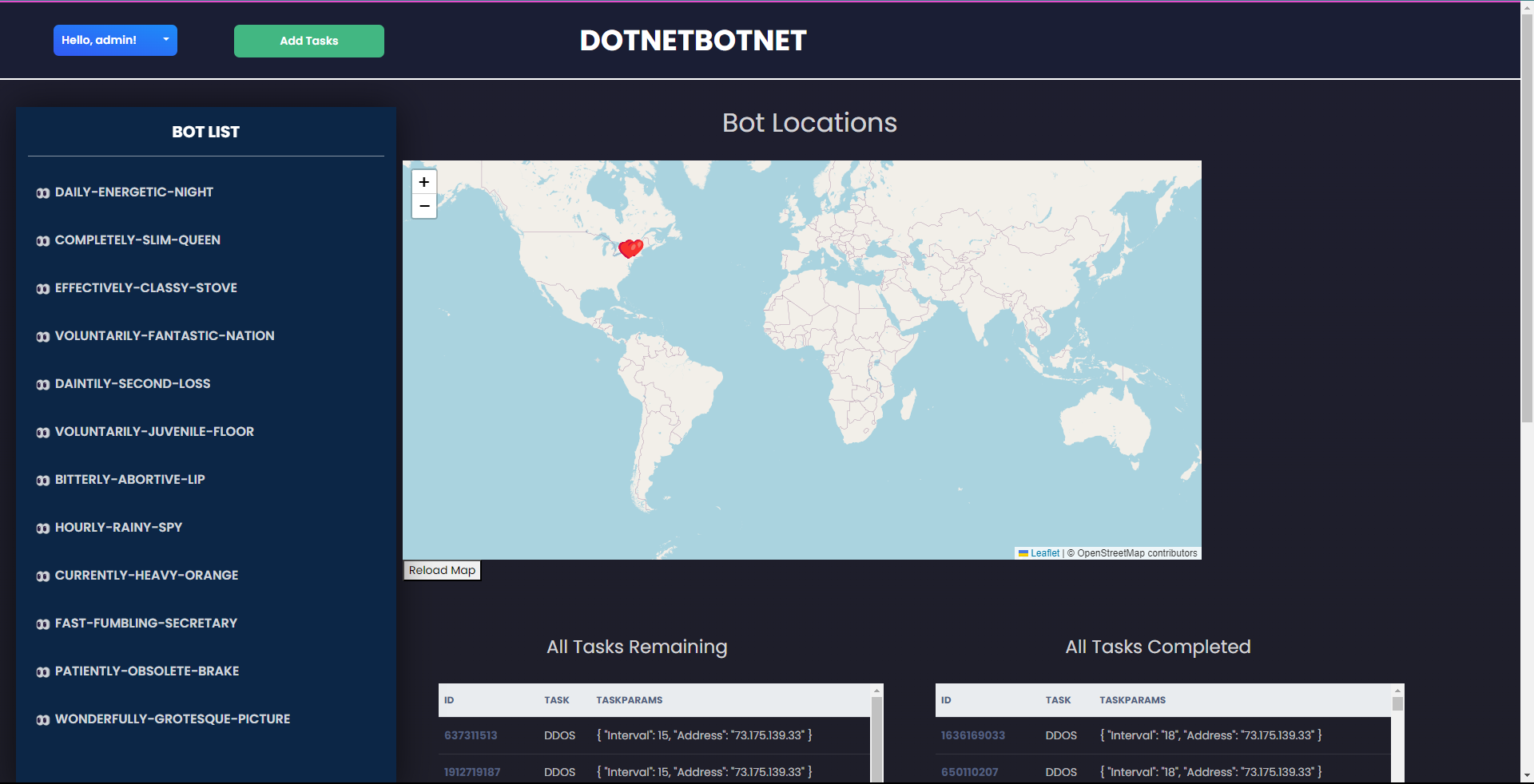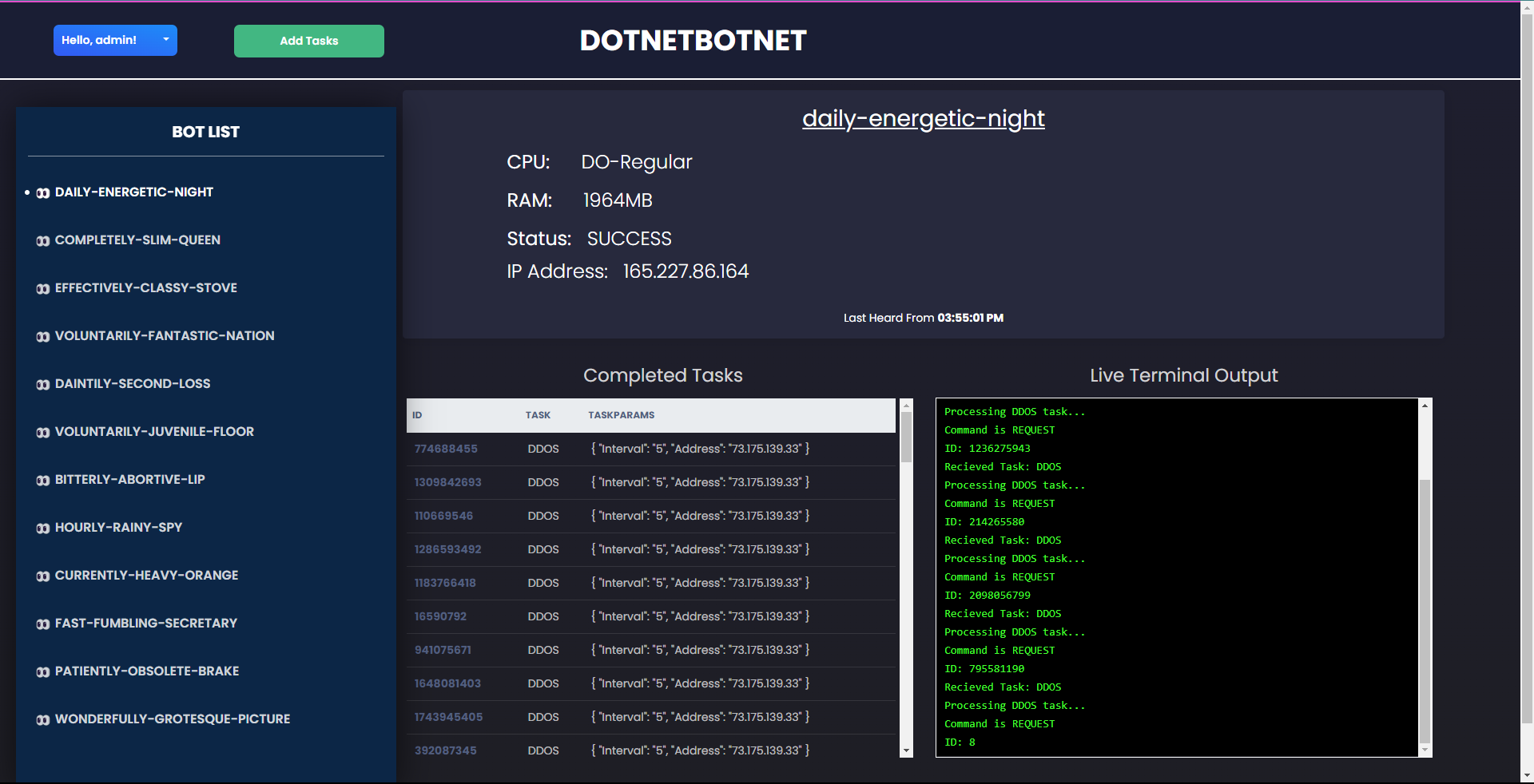 .NETBotNet is a botnet that was created for a Hackathon competition in the Fall of 2023. The project consists of three pieces: a C2 control server, a bot program (referred to as workers), and a web hosted user interface. The C2 server was developed using the .NET Core framework, along with the use of the ASP.NET framework for the development of the API, and it handles all requests made from the user interface and distributes them to the desired workers. The bot program was developed in C++, has functionality for both Windows and Linux based machines, and performs all tasks received from the C2 server. Finally, the web hosted user interface was developed using the Vue.js framework and is where all requests are made to the C2 server. As of now, the botnet can solely send out DDOS attacks to specified machines, or all machines that are connected to the server through their worker, and the team behind .NETBotNet have no plans to continue any further development of the project. Below, you can find some screenshots of the user interface to get a better idea of how the botnet is managed: