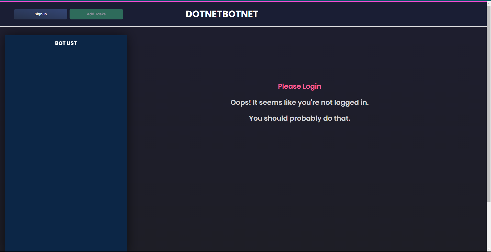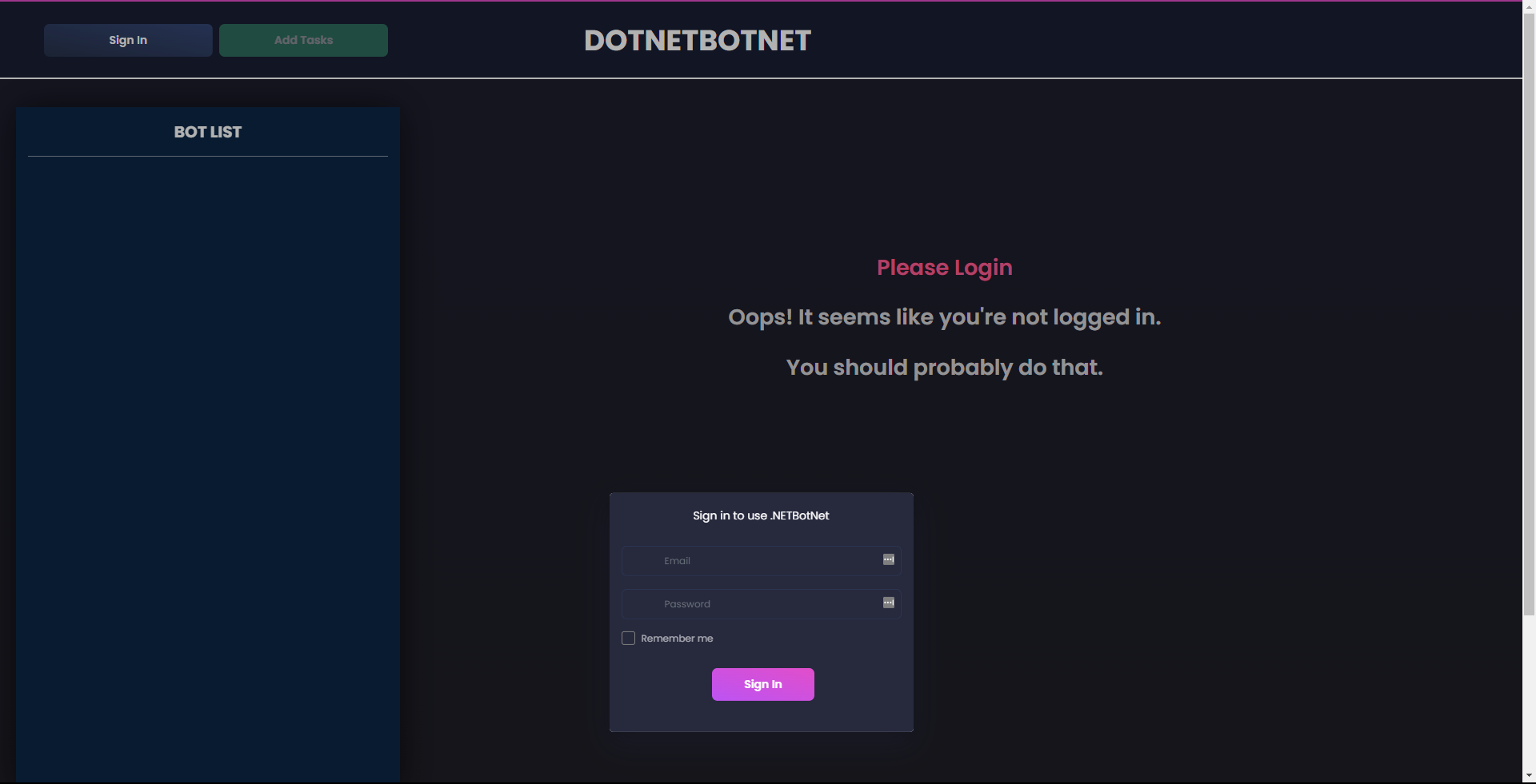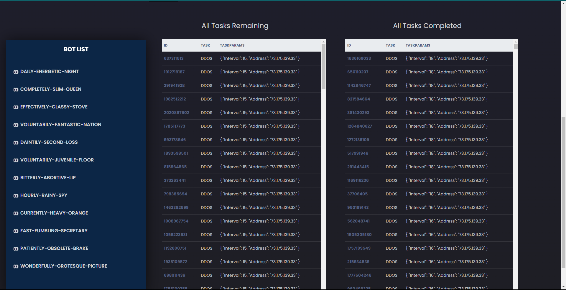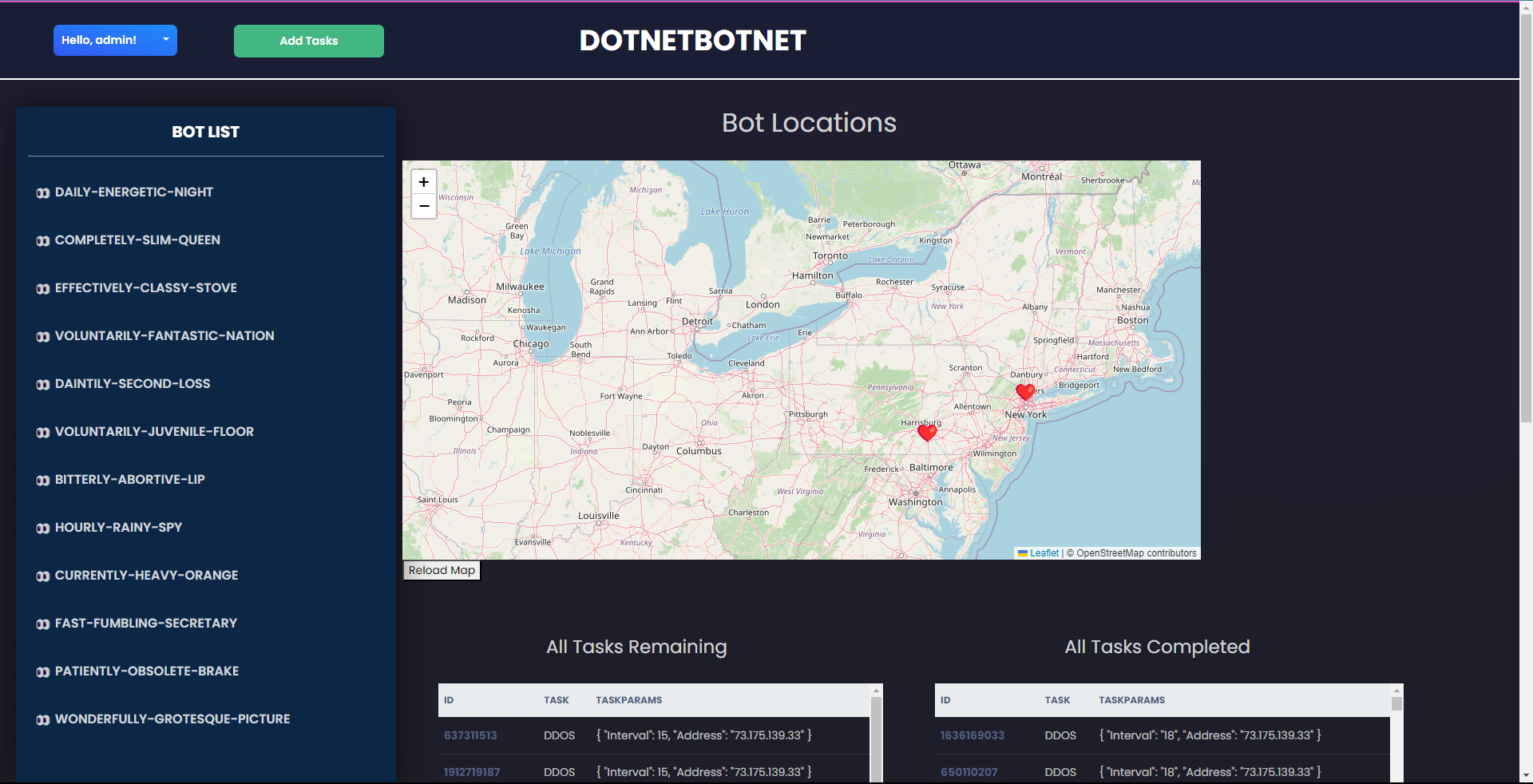 .NETBotNet is a botnet that was created for a Hackathon competition in the Fall of 2023. The project consists of three pieces: a C2 control server, a bot program (referred to as workers), and a web hosted user interface. The C2 server was developed using the .NET Core framework, along with the use of the ASP.NET framework for the development of the API, and it handles all requests made from the user interface and distributes them to the desired workers. The bot program was developed in C++, has functionality for both Windows and Linux based machines, and performs all tasks received from the C2 server. Finally, the web hosted user interface was developed using the Vue.js framework and is where all requests are made to the C2 server. As of now, the botnet can solely send out DDOS attacks to specified machines, or all machines that are connected to the server through their worker, and the team behind .NETBotNet have no plans to continue any further development of the project. Below, you can find some screenshots of the user interface to get a better idea of how the botnet is managed: